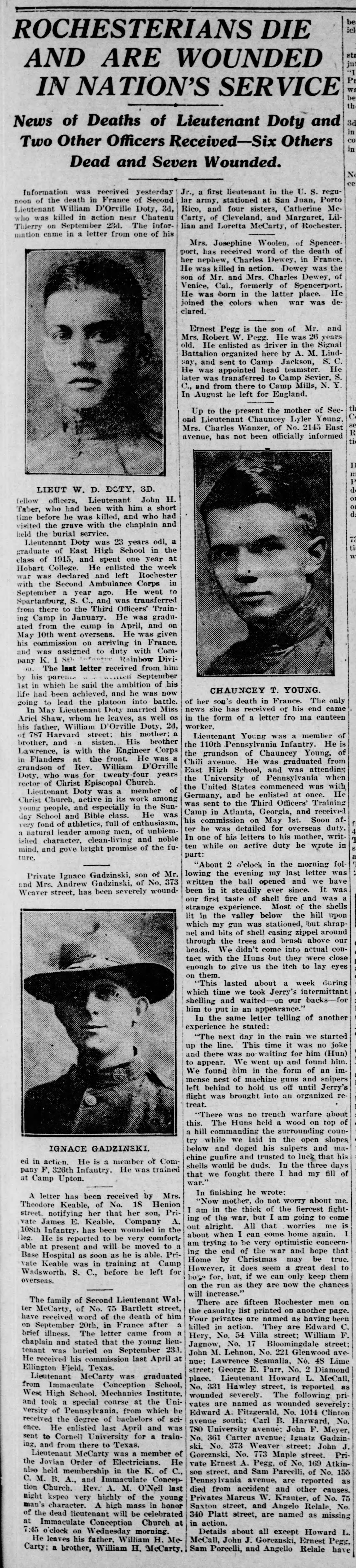 1918-10-20 McCarty_Walter Democrat_and_Chronicle_Sun_ Published on October 12, 2018 in Wilson High School World War I Memorial: Walter Riley McCarty 5/11/1890 -9/20/18Full resolution (1751 × 7710) Next →