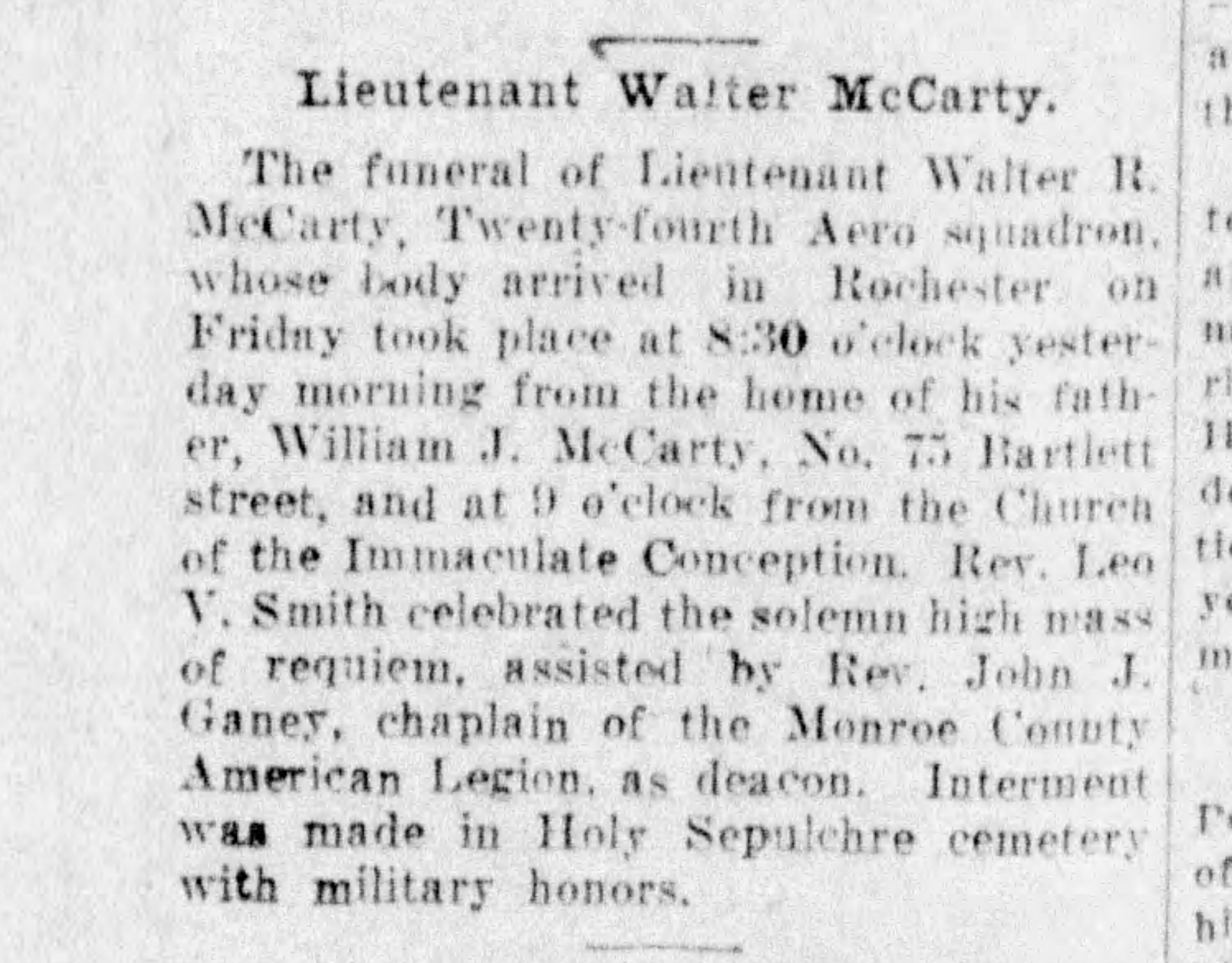 1921-5-29 McCarty_Walter Democrat_and_Chronicle_Sun_ Published on October 12, 2018 in Wilson High School World War I Memorial: Walter Riley McCarty 5/11/1890 -9/20/18Full resolution (4650 × 3636) ← Previous Next →