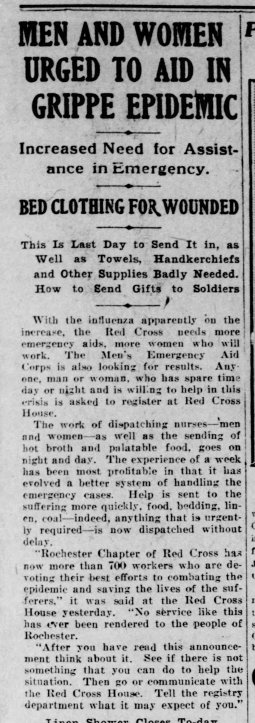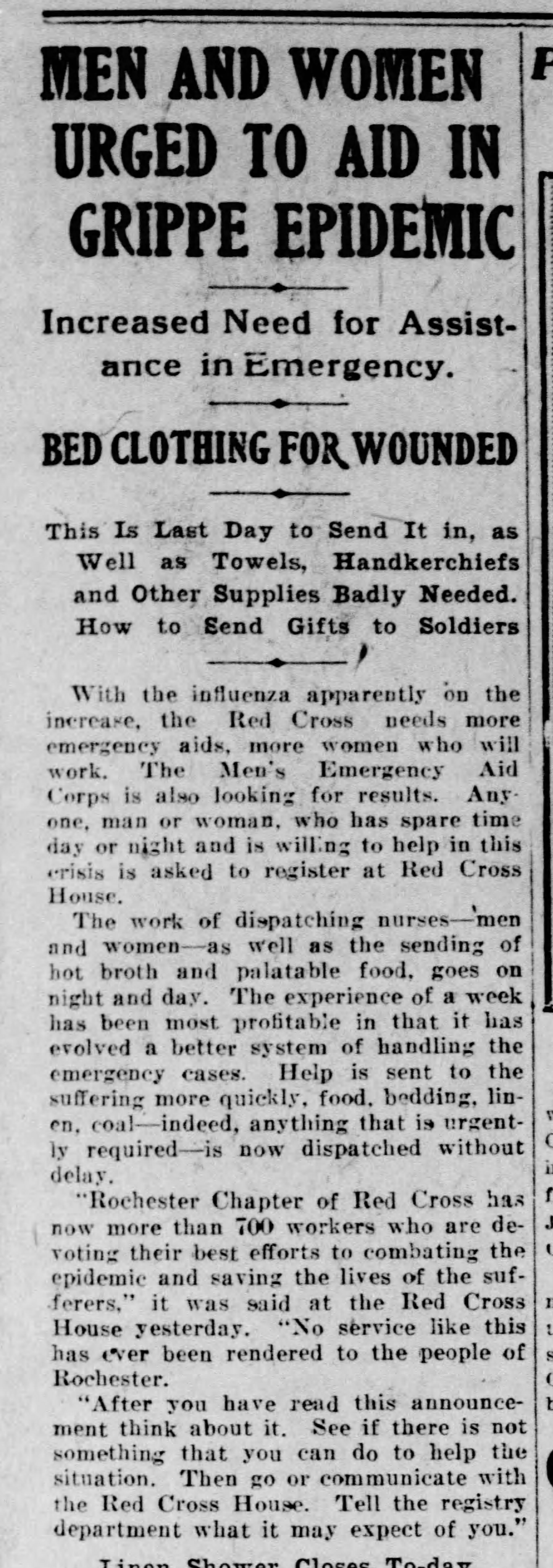 1918-10-26 Red Cross needs more help Democrat_and_Chronicle_Sat__Oct_26__1918_ Published on May 8, 2020 in October 26th, 1918 Rochester and the Influenza pandemicFull resolution (2739 × 7767) ← Previous