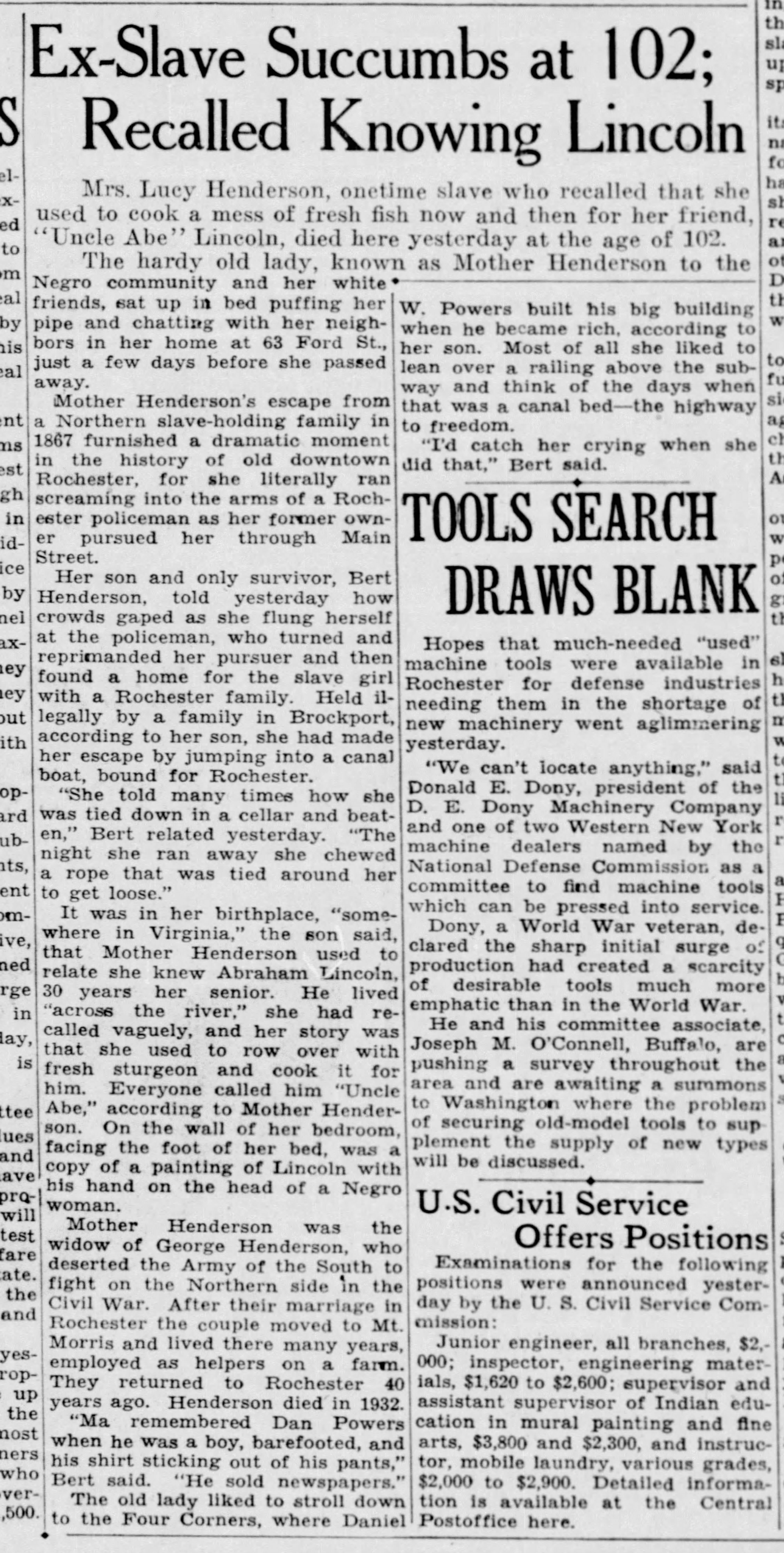 In a life that could easily be a major motion picture, the girl who would become Mrs. Lucy Henderson, was born an enslaved person in 1839 in Virginia. She recalls rowing across the River (possibly the Potomac) and bringing dinner to President Lincoln. She was then brought illegally to Brockport and kept as an enslaved person and recalls being tied with ropes. In a daring escape, she jumped on a canal boat and made it Rochester, read the article for more.