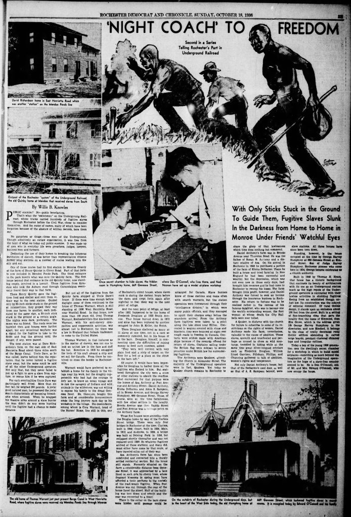 “A HISTORY of Rochester would hardly be complete without some reference to the wonderful “Underground railroad,’ which was kept in active operation as long as slavery of the negro race continued. The secresy of its constructions, its marvelous origin, the great number of passengers, the amount of freight transported thereon, can never be told. All its work was done in the dark. Although it had its depots, stations, passenger agents and conductors in every state in the Union, daylight never shone upon it. Its stations had no electric light, and the passengers; no guide aside from that blessed light in the heavens known as the North star. Ignorant as these people were of book-learning, they all knew where to find the luminary which, they had learned, would lead