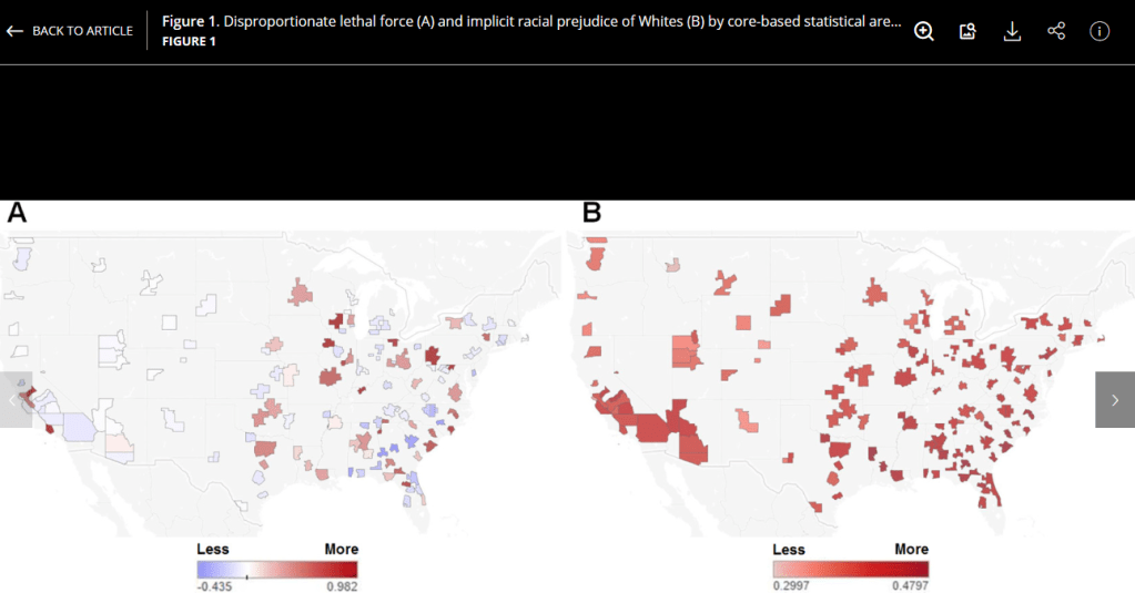 The study found a strong correlation between the implicit biases in a region and the number of fatal police shootings of individuals of color. Specifically, the study found that “We find that the implicit racial biases of White residents predict disproportionate regional use of lethal force with Blacks by police. This association is robust, reliably emerging across two conceptually distinct measures of racial bias, multiple imputations, three different transformations of the outcome measure, traditional and bootstrapped distributions, and above and beyond 14 sociodemographic covariates. Though the implicit prejudice of Whites is sufficient to significantly predict disproportionate lethal force (Analysis 1), the strongest predictor of lethal force was the regional implicit stereotypical association between Blacks and weapons (Analysis 2).” This means the more a community associates people of color with weapons the more people of color are killed by police.